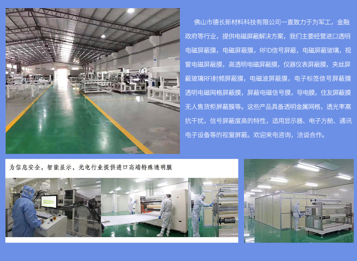 佛山市德長新材料科技有限公司(悅民新材)一直致力于為軍工,金融,政府等行業,提供電磁屏蔽解決方案,我們主要經營進口透明電磁屏蔽膜,電磁屏蔽膜,RFID信號屏蔽,電磁屏蔽玻璃,視窗電磁屏蔽膜,高透明電磁屏蔽膜,儀器儀表屏蔽膜,夾絲屏蔽玻璃,RFI射頻屏蔽膜,電磁波屏蔽膜,電子標簽信號屏蔽膜,透明電磁網格屏蔽膜,屏蔽電磁信號膜,導電膜,住友屏蔽膜,無人售貨柜屏蔽膜等。這些產品具備透明金屬網格,透光率高,抗干擾,信號屏蔽度高的特性,適用顯示器、電子方艙、通訊電子設備等的視窗屏蔽。歡迎來電咨詢,洽談合作。